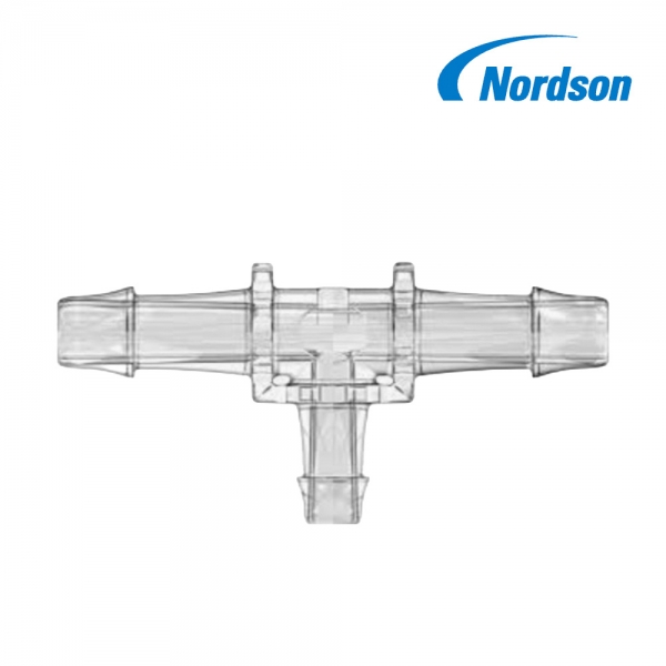 Nordson Tee Reducer는 Nordson MEDICAL 브랜드의 바브(Barb)형 튜브-투-튜브 피팅으로, T자형 구조를 기반으로 세 방향 연결 중 한 방향 또는 두 방향으로 서로 다른 튜브 내경(ID)을 축소/연결해 주는 감소용(리듀서) 삼통 커넥터입니다.